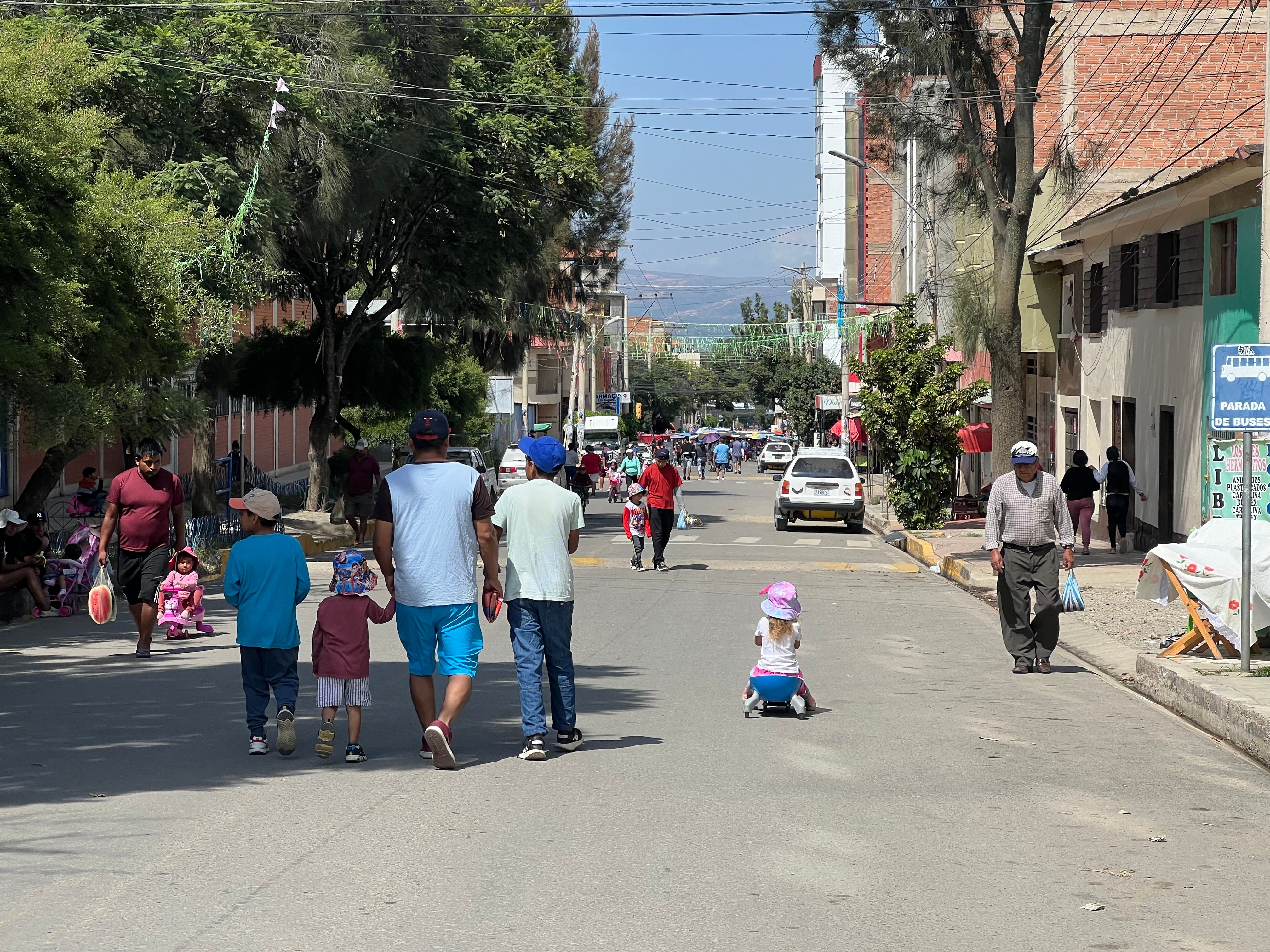 Yesterday was Día del Peatón—Pedestrian Day—when all of metro Cochabamba valley, with its ~1.5 million inhabitants, is free of motor vehicles and the streets are full of people on foot, bike, roller skates, scooters, strollers and all manner of baby cars. We walked from our home at the foot of the mountain to Tiquipaya town’s plaza, and instead of taking our usual back-street dirt-and-cobbled route, we took the main paved avenue, a 20-minute walk downhill. With the street blissfully clear of cars and trucks, birds sang the praises of the air flowing clean and quiet, and children, youth, adults and old folks were all strolling, cruising along on people-powered wheels, or just standing in the middle of the road. As usual, food was being served on the sides of the road, and today there were more than the usual small clusters of people eating and drinking at tables laden with huge mounds of food. Grills smoked and frying pans sizzled on the sidewalk, pots steaming as they were carried full from the cooks’ gardens and homes that peek behind the walls lining the road. As Mwende and I moseyed along, the kiddo cruised on her little low-to-the-ground “avión” car. We passed other full gardens: patio parties and chicherías blasting reggaetón and Andean folklore. The regular Sunday market was buzzing downtown, with all its usual color and sound and smells of homemade food brightened by the absence of motor noise and exhaust that usually filters in. The plaza was hopping with blow-up jump houses, inflatable slides, trampolines and potato sack races for the kids, as well as tether ball and quizzes with saplings as prizes for the adults.